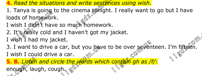 4. Read the situations and write sentences using wish. 1. Tanya is going to the cinema tonight. I really want to go but I have loads of homework. I wish I didn’t have so much homework. 2. It’s really cold and I haven’t got my jacket. I wish I had my jacket. 3. I want to drive a car, but you have to be over seventeen. I’m fifteen. I wish I could drive a car. 5. B. Listen and circle the words which contain gh as /f/: enough, laugh, cough.