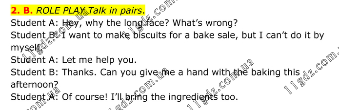 B. ROLE PLAY Talk in pairs. Student A: Hey, why the long face? What’s wrong? Student B: I want to make biscuits for a bake sale, but I can’t do it by myself. Student A: Let me help you. Student B: Thanks. Can you give me a hand with the baking this afternoon? Student A: Of course! I’ll bring the ingredients too.