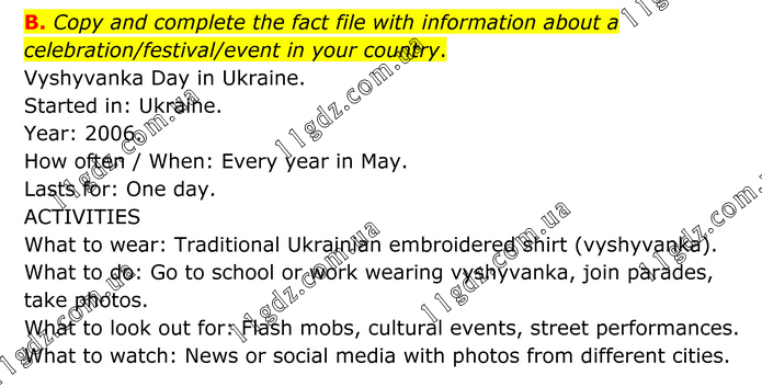 Copy and complete the fact file with information about a celebration/festival/event in your country. Vyshyvanka Day in Ukraine. Started in: Ukraine. Year: 2006. How often / When: Every year in May. Lasts for: One day. ACTIVITIES What to wear: Traditional Ukrainian embroidered shirt (vyshyvanka). What to do: Go to school or work wearing vyshyvanka, join parades, take photos. What to look out for: Flash mobs, cultural events, street performances. What to watch: News or social media with photos from different cities.