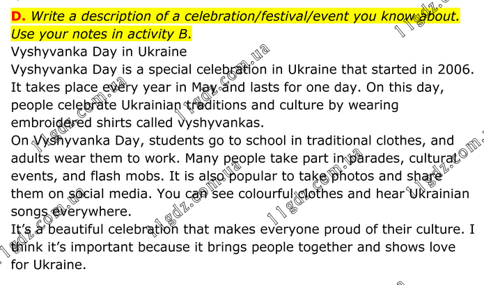 Write a description of a celebration/festival/event you know about. Use your notes in activity B. Vyshyvanka Day in Ukraine Vyshyvanka Day is a special celebration in Ukraine that started in 2006. It takes place every year in May and lasts for one day. On this day, people celebrate Ukrainian traditions and culture by wearing embroidered shirts called vyshyvankas. On Vyshyvanka Day, students go to school in traditional clothes, and adults wear them to work. Many people take part in parades, cultural events, and flash mobs. It is also popular to take photos and share them on social media. You can see colourful clothes and hear Ukrainian songs everywhere. It’s a beautiful celebration that makes everyone proud of their culture. I think it’s important because it brings people together and shows love for Ukraine.