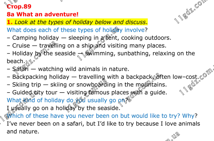 8a What an adventure! 1. Look at the types of holiday below and discuss. What does each of these types of holiday involve? – Camping holiday — sleeping in a tent, cooking outdoors. – Cruise — travelling on a ship and visiting many places. – Holiday by the seaside — swimming, sunbathing, relaxing on the beach. – Safari — watching wild animals in nature. – Backpacking holiday — travelling with a backpack, often low–cost. – Skiing trip — skiing or snowboarding in the mountains. – Guided city tour — visiting famous places with a guide. What kind of holiday do you usually go on? I usually go on a holiday by the seaside. Which of these have you never been on but would like to try? Why? I’ve never been on a safari, but I’d like to try because I love animals and nature.