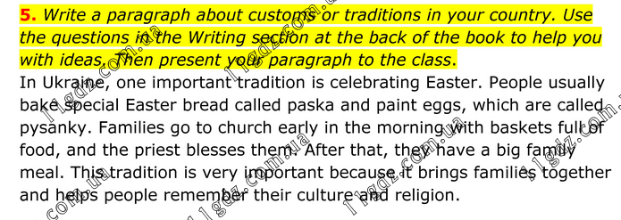Write a paragraph about customs or traditions in your country. Use the questions in the Writing section at the back of the book to help you with ideas. Then present your paragraph to the class. In Ukraine, one important tradition is celebrating Easter. People usually bake special Easter bread called paska and paint eggs, which are called pysanky. Families go to church early in the morning with baskets full of food, and the priest blesses them. After that, they have a big family meal. This tradition is very important because it brings families together and helps people remember their culture and religion.