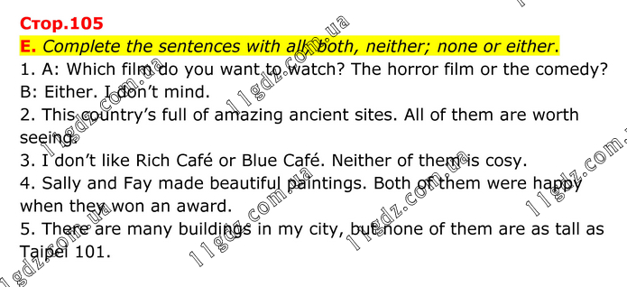 E. Complete the sentences with all, both, neither; none or either. 1. A: Which film do you want to watch? The horror film or the comedy? B: Either. I don’t mind. 2. This country’s full of amazing ancient sites. All of them are worth seeing. 3. I don’t like Rich Café or Blue Café. Neither of them is cosy. 4. Sally and Fay made beautiful paintings. Both of them were happy when they won an award. 5. There are many buildings in my city, but none of them are as tall as Taipei 101.