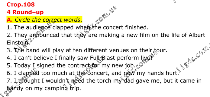 4 Round–up A. Circle the correct words. 1. The audience clapped when the concert finished. 2. They announced that they are making a new film on the life of Albert Einstein. 3. The band will play at ten different venues on their tour. 4. I can’t believe I finally saw Full Blast perform live! 5. Today I signed the contract for my new job. 6. I clapped too much at the concert, and now my hands hurt. 7. I thought I wouldn’t need the torch my dad gave me, but it came in handy on my camping trip.