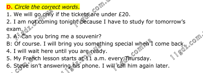 D. Circle the correct words. 1. We will go only if the tickets are under £20. 2. I am not coming tonight because I have to study for tomorrow’s exam. 3. A: Can you bring me a souvenir? B: Of course. I will bring you something special when I come back. 4. I will wait here until you are ready. 5. My French lesson starts at 11 a.m. every Thursday. 6. Steve isn’t answering his phone. I will call him again later.