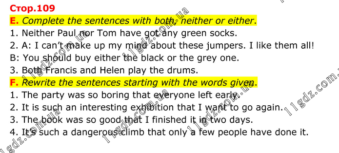 E. Complete the sentences with both, neither or either. 1. Neither Paul nor Tom have got any green socks. 2. A: I can’t make up my mind about these jumpers. I like them all! B: You should buy either the black or the grey one. 3. Both Francis and Helen play the drums. F. Rewrite the sentences starting with the words given. 1. The party was so boring that everyone left early. 2. It is such an interesting exhibition that I want to go again. 3. The book was so good that I finished it in two days. 4. It’s such a dangerous climb that only a few people have done it.