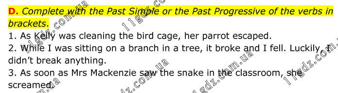 D. Complete with the Past Simple or the Past Progressive of the verbs in brackets. 1. As Kelly was cleaning the bird cage, her parrot escaped. 2. While I was sitting on a branch in a tree, it broke and I fell. Luckily, I didn’t break anything. 3. As soon as Mrs Mackenzie saw the snake in the classroom, she screamed.