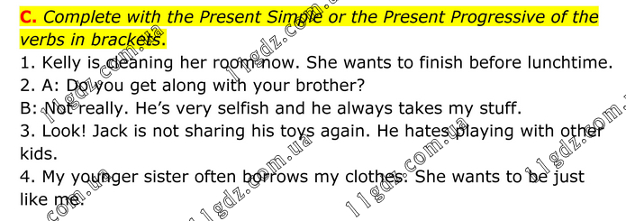 Complete with the Present Simple or the Present Progressive of the verbs in brackets. 1. Kelly is cleaning her room now. She wants to finish before lunchtime. 2. A: Do you get along with your brother? B: Not really. He’s very selfish and he always takes my stuff. 3. Look! Jack is not sharing his toys again. He hates playing with other kids. 4. My younger sister often borrows my clothes. She wants to be just like me.