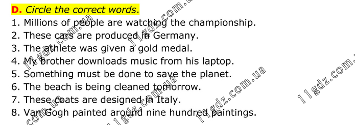 D. Circle the correct words. 1. Millions of people are watching the championship. 2. These cars are produced in Germany. 3. The athlete was given a gold medal. 4. My brother downloads music from his laptop. 5. Something must be done to save the planet. 6. The beach is being cleaned tomorrow. 7. These coats are designed in Italy. 8. Van Gogh painted around nine hundred paintings.