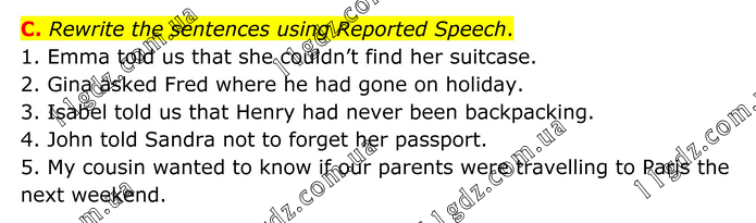 C. Rewrite the sentences using Reported Speech. 1. Emma told us that she couldn’t find her suitcase. 2. Gina asked Fred where he had gone on holiday. 3. Isabel told us that Henry had never been backpacking. 4. John told Sandra not to forget her passport. 5. My cousin wanted to know if our parents were travelling to Paris the next weekend.