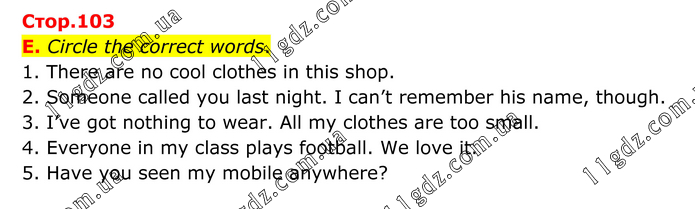 E. Circle the correct words. 1. There are no cool clothes in this shop. 2. Someone called you last night. I can’t remember his name, though. 3. I’ve got nothing to wear. All my clothes are too small. 4. Everyone in my class plays football. We love it. 5. Have you seen my mobile anywhere?