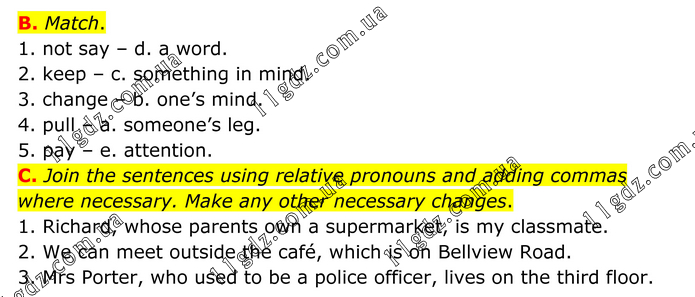 B. Match. 1. not say – d. a word. 2. keep – c. something in mind. 3. change – b. one’s mind. 4. pull – a. someone’s leg. 5. pay – e. attention. C. Join the sentences using relative pronouns and adding commas where necessary. Make any other necessary changes. 1. Richard, whose parents own a supermarket, is my classmate. 2. We can meet outside the café, which is on Bellview Road. 3. Mrs Porter, who used to be a police officer, lives on the third floor.