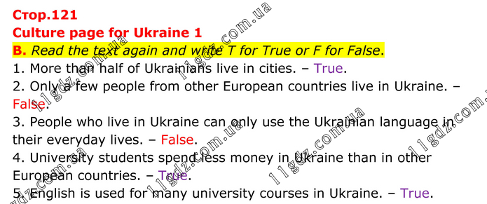 Culture page for Ukraine 1 B. Read the text again and write T for True or F for False. 1. More than half of Ukrainians live in cities. – True. 2. Only a few people from other European countries live in Ukraine. – False. 3. People who live in Ukraine can only use the Ukrainian language in their everyday lives. – False. 4. University students spend less money in Ukraine than in other European countries. – True. 5. English is used for many university courses in Ukraine. – True.