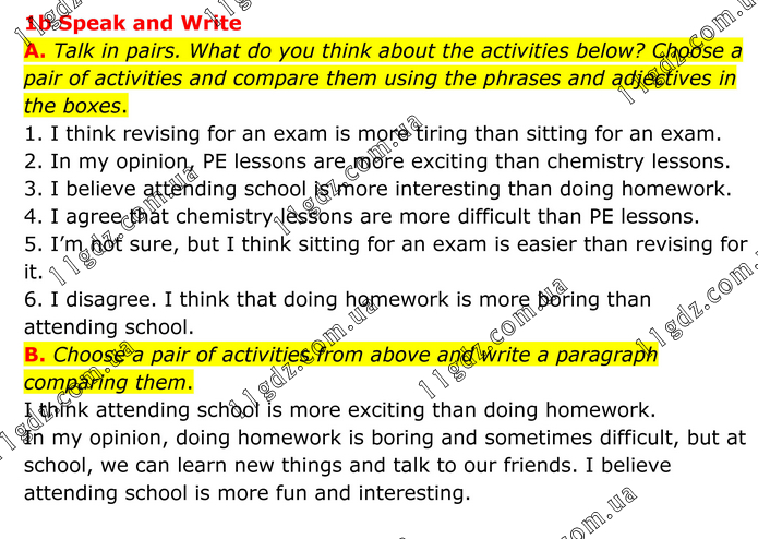 1b Speak and Write A. Talk in pairs. What do you think about the activities below? Choose a pair of activities and compare them using the phrases and adjectives in the boxes. 1. I think revising for an exam is more tiring than sitting for an exam. 2. In my opinion, PE lessons are more exciting than chemistry lessons. 3. I believe attending school is more interesting than doing homework. 4. I agree that chemistry lessons are more difficult than PE lessons. 5. I’m not sure, but I think sitting for an exam is easier than revising for it. 6. I disagree. I think that doing homework is more boring than attending school. B. Choose a pair of activities from above and write a paragraph comparing them. I think attending school is more exciting than doing homework. In my opinion, doing homework is boring and sometimes difficult, but at school, we can learn new things and talk to our friends. I believe attending school is more fun and interesting.
