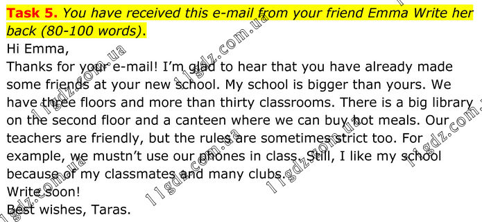 Task 5. You have received this e-mail from your friend Emma Write her back (80-100 words). Hi Emma, Thanks for your e-mail! I’m glad to hear that you have already made some friends at your new school. My school is bigger than yours. We have three floors and more than thirty classrooms. There is a big library on the second floor and a canteen where we can buy hot meals. Our teachers are friendly, but the rules are sometimes strict too. For example, we mustn’t use our phones in class. Still, I like my school because of my classmates and many clubs. Write soon! Best wishes, Taras.