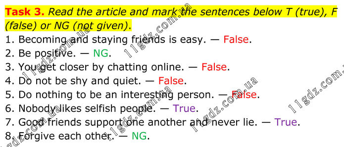 Task 3. Read the article and mark the sentences below T (true), F (false) or NG (not given). 1. Becoming and staying friends is easy. — False. 2. Be positive. — NG. 3. You get closer by chatting online. — False. 4. Do not be shy and quiet. — False. 5. Do nothing to be an interesting person. — False. 6. Nobody likes selfish people. — True. 7. Good friends support one another and never lie. — True. 8. Forgive each other. — NG.
