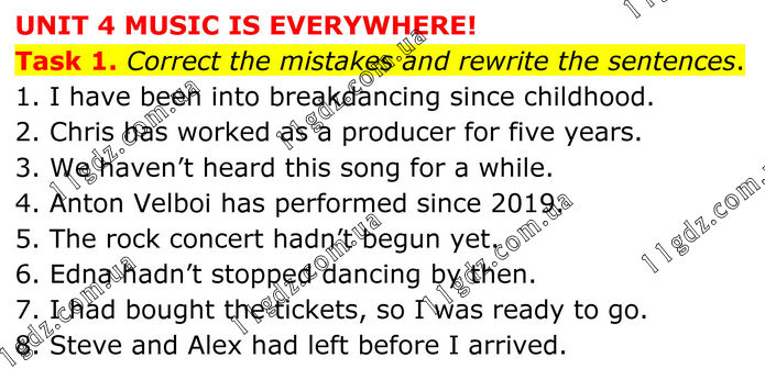 UNIT 4 MUSIC IS EVERYWHERE! Task 1. Correct the mistakes and rewrite the sentences. 1. I have been into breakdancing since childhood. 2. Chris has worked as a producer for five years. 3. We haven’t heard this song for a while. 4. Anton Velboi has performed since 2019. 5. The rock concert hadn’t begun yet. 6. Edna hadn’t stopped dancing by then. 7. I had bought the tickets, so I was ready to go. 8. Steve and Alex had left before I arrived.