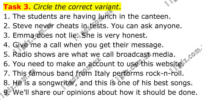 Task 3. Circle the correct variant. 1. The students are having lunch in the canteen. 2. Steve never cheats in tests. You can ask anyone. 3. Emma does not lie. She is very honest. 4. Give me a call when you get their message. 5. Radio shows are what we call broadcast media. 6. You need to make an account to use this website. 7. This famous band from Italy performs rock-n-roll. 8. He is a songwriter, and this is one of his best songs. 9. We’ll share our opinions about how it should be done.