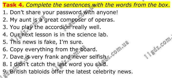 Task 4. Complete the sentences with the words from the box. 1. Don’t share your password with anyone! 2. My aunt is a great composer of operas. 3. You play the accordion really well. 4. Our next lesson is in the science lab. 5. This news is fake, I’m sure. 6. Copy everything from the board. 7. Dave is very frank and never selfish. 8. I didn’t catch the last word you said. 9. British tabloids offer the latest celebrity news.