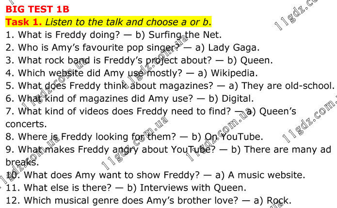 BIG TEST 1B Task 1. Listen to the talk and choose a or b. 1. What is Freddy doing? — b) Surfing the Net. 2. Who is Amy’s favourite pop singer? — a) Lady Gaga. 3. What rock band is Freddy’s project about? — b) Queen. 4. Which website did Amy use mostly? — a) Wikipedia. 5. What does Freddy think about magazines? — a) They are old-school. 6. What kind of magazines did Amy use? — b) Digital. 7. What kind of videos does Freddy need to find? — a) Queen’s concerts. 8. Where is Freddy looking for them? — b) On YouTube. 9. What makes Freddy angry about YouTube? — b) There are many ad breaks. 10. What does Amy want to show Freddy? — a) A music website. 11. What else is there? — b) Interviews with Queen. 12. Which musical genre does Amy’s brother love? — a) Rock.
