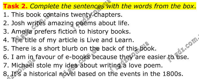 Task 2. Complete the sentences with the words from the box. 1. This book contains twenty chapters. 2. Josh writes amazing poems about life. 3. Amelia prefers fiction to history books. 4. The title of my article is Live and Learn. 5. There is a short blurb on the back of this book. 6. I am in favour of e-books because they are easier to use. 7. Michael stole my idea about writing a love poem. 8. It’s a historical novel based on the events in the 1800s.