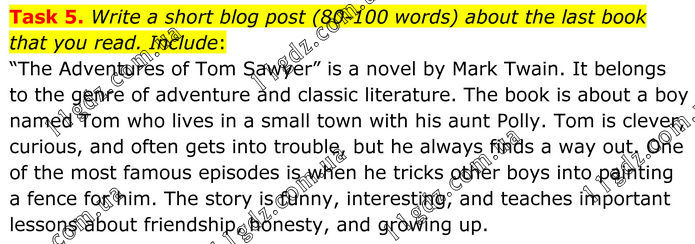 Task 5. Write a short blog post (80-100 words) about the last book that you read. Include: “The Adventures of Tom Sawyer” is a novel by Mark Twain. It belongs to the genre of adventure and classic literature. The book is about a boy named Tom who lives in a small town with his aunt Polly. Tom is clever, curious, and often gets into trouble, but he always finds a way out. One of the most famous episodes is when he tricks other boys into painting a fence for him. The story is funny, interesting, and teaches important lessons about friendship, honesty, and growing up.