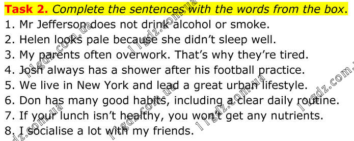 Task 2. Complete the sentences with the words from the box. 1. Mr Jefferson does not drink alcohol or smoke. 2. Helen looks pale because she didn’t sleep well. 3. My parents often overwork. That’s why they’re tired. 4. Josh always has a shower after his football practice. 5. We live in New York and lead a great urban lifestyle. 6. Don has many good habits, including a clear daily routine. 7. If your lunch isn’t healthy, you won’t get any nutrients. 8. I socialise a lot with my friends.