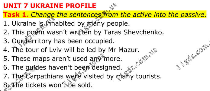 UNIT 7 UKRAINE PROFILE Task 1. Change the sentences from the active into the passive. 1. Ukraine is inhabited by many people. 2. This poem wasn’t written by Taras Shevchenko. 3. Our territory has been occupied. 4. The tour of Lviv will be led by Mr Mazur. 5. These maps aren’t used any more. 6. The guides haven’t been designed. 7. The Carpathians were visited by many tourists. 8. The tickets won’t be sold.