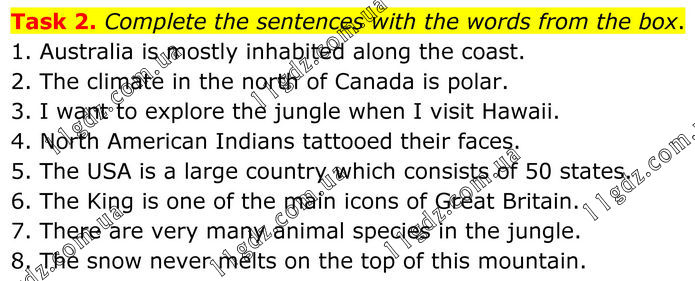 Task 2. Complete the sentences with the words from the box. 1. Australia is mostly inhabited along the coast. 2. The climate in the north of Canada is polar. 3. I want to explore the jungle when I visit Hawaii. 4. North American Indians tattooed their faces. 5. The USA is a large country which consists of 50 states. 6. The King is one of the main icons of Great Britain. 7. There are very many animal species in the jungle. 8. The snow never melts on the top of this mountain.