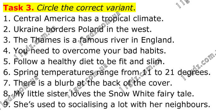 Task 3. Circle the correct variant. 1. Central America has a tropical climate. 2. Ukraine borders Poland in the west. 3. The Thames is a famous river in England. 4. You need to overcome your bad habits. 5. Follow a healthy diet to be fit and slim. 6. Spring temperatures range from 11 to 21 degrees. 7. There is a blurb at the back of the cover. 8. My little sister loves the Snow White fairy tale. 9. She’s used to socialising a lot with her neighbours.