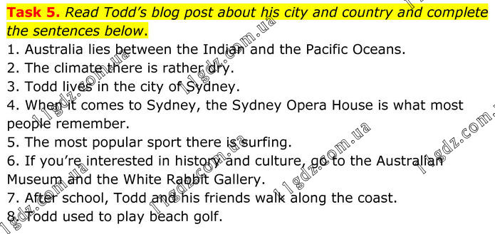 Task 5. Read Todd’s blog post about his city and country and complete the sentences below. 1. Australia lies between the Indian and the Pacific Oceans. 2. The climate there is rather dry. 3. Todd lives in the city of Sydney. 4. When it comes to Sydney, the Sydney Opera House is what most people remember. 5. The most popular sport there is surfing. 6. If you’re interested in history and culture, go to the Australian Museum and the White Rabbit Gallery. 7. After school, Todd and his friends walk along the coast. 8. Todd used to play beach golf.