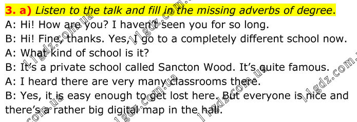 3. a) Listen to the talk and fill in the missing adverbs of degree. A: Hi! How are you? I haven’t seen you for so long. B: Hi! Fine, thanks. Yes, I go to a completely different school now. A: What kind of school is it? B: It’s a private school called Sancton Wood. It’s quite famous. A: I heard there are very many classrooms there. B: Yes, it is easy enough to get lost here. But everyone is nice and there’s a rather big digital map in the hall.