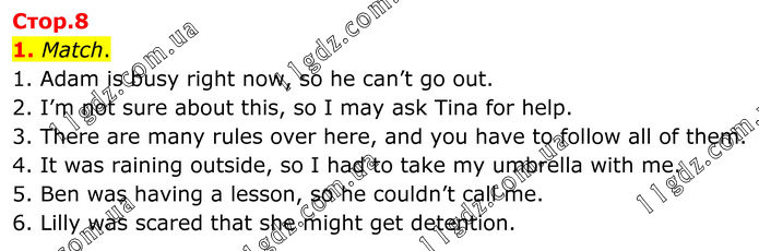1. Match. 1. Adam is busy right now, so he can’t go out. 2. I’m not sure about this, so I may ask Tina for help. 3. There are many rules over here, and you have to follow all of them. 4. It was raining outside, so I had to take my umbrella with me. 5. Ben was having a lesson, so he couldn’t call me. 6. Lilly was scared that she might get detention.