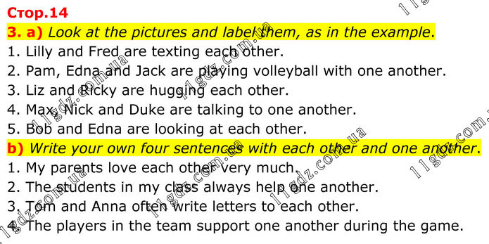 3. a) Look at the pictures and label them, as in the example. 1. Lilly and Fred are texting each other. 2. Pam, Edna and Jack are playing volleyball with one another. 3. Liz and Ricky are hugging each other. 4. Max, Nick and Duke are talking to one another. 5. Bob and Edna are looking at each other. b) Write your own four sentences with each other and one another. 1. My parents love each other very much. 2. The students in my class always help one another. 3. Tom and Anna often write letters to each other. 4. The players in the team support one another during the game.