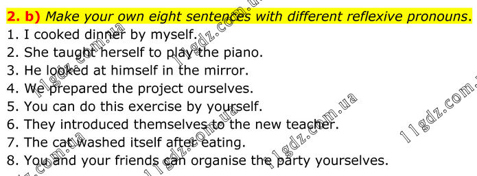 2. b) Make your own eight sentences with different reflexive pronouns. 1. I cooked dinner by myself. 2. She taught herself to play the piano. 3. He looked at himself in the mirror. 4. We prepared the project ourselves. 5. You can do this exercise by yourself. 6. They introduced themselves to the new teacher. 7. The cat washed itself after eating. 8. You and your friends can organise the party yourselves.