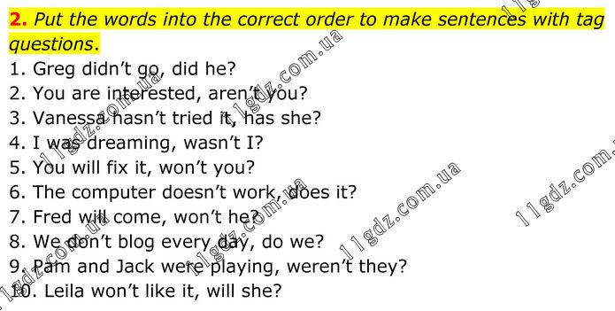 2. Put the words into the correct order to make sentences with tag questions. 1. Greg didn’t go, did he? 2. You are interested, aren’t you? 3. Vanessa hasn’t tried it, has she? 4. I was dreaming, wasn’t I? 5. You will fix it, won’t you? 6. The computer doesn’t work, does it? 7. Fred will come, won’t he? 8. We don’t blog every day, do we? 9. Pam and Jack were playing, weren’t they? 10. Leila won’t like it, will she?