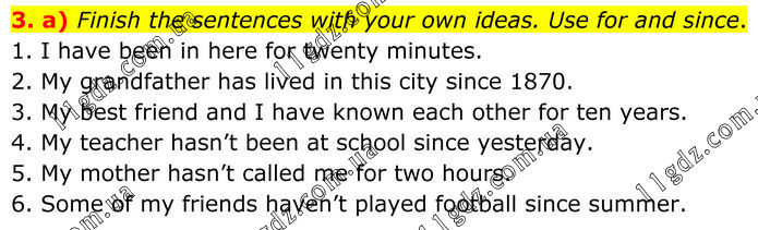 3. a) Finish the sentences with your own ideas. Use for and since. 1. I have been in here for twenty minutes. 2. My grandfather has lived in this city since 1870. 3. My best friend and I have known each other for ten years. 4. My teacher hasn’t been at school since yesterday. 5. My mother hasn’t called me for two hours. 6. Some of my friends haven’t played football since summer.