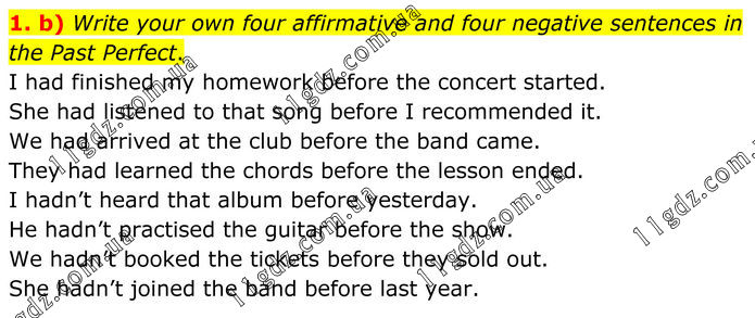 1. b) Write your own four affirmative and four negative sentences in the Past Perfect. I had finished my homework before the concert started. She had listened to that song before I recommended it. We had arrived at the club before the band came. They had learned the chords before the lesson ended. I hadn’t heard that album before yesterday. He hadn’t practised the guitar before the show. We hadn’t booked the tickets before they sold out. She hadn’t joined the band before last year.