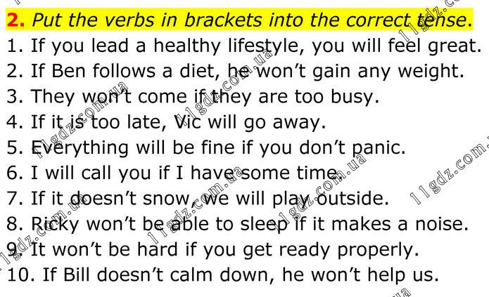 2. Put the verbs in brackets into the correct tense. 1. If you lead a healthy lifestyle, you will feel great. 2. If Ben follows a diet, he won’t gain any weight. 3. They won’t come if they are too busy. 4. If it is too late, Vic will go away. 5. Everything will be fine if you don’t panic. 6. I will call you if I have some time. 7. If it doesn’t snow, we will play outside. 8. Ricky won’t be able to sleep if it makes a noise. 9. It won’t be hard if you get ready properly. 10. If Bill doesn’t calm down, he won’t help us.