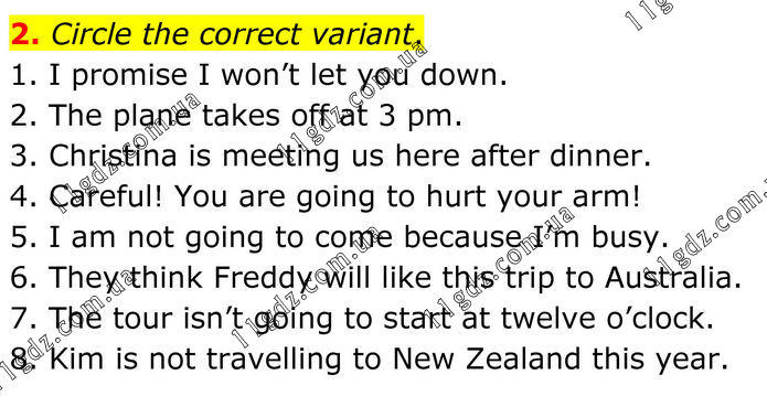 2. Circle the correct variant. 1. I promise I won’t let you down. 2. The plane takes off at 3 pm. 3. Christina is meeting us here after dinner. 4. Careful! You are going to hurt your arm! 5. I am not going to come because I’m busy. 6. They think Freddy will like this trip to Australia. 7. The tour isn’t going to start at twelve o’clock. 8. Kim is not travelling to New Zealand this year.