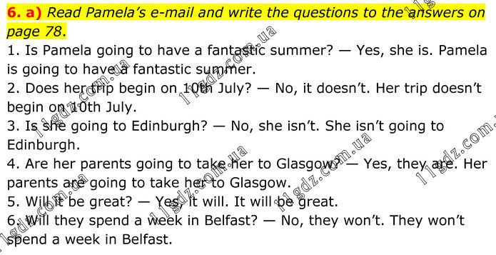 6. a) Read Pamela’s e-mail and write the questions to the answers on page 78. 1. Is Pamela going to have a fantastic summer? — Yes, she is. Pamela is going to have a fantastic summer. 2. Does her trip begin on 10th July? — No, it doesn’t. Her trip doesn’t begin on 10th July. 3. Is she going to Edinburgh? — No, she isn’t. She isn’t going to Edinburgh. 4. Are her parents going to take her to Glasgow? — Yes, they are. Her parents are going to take her to Glasgow. 5. Will it be great? — Yes, it will. It will be great. 6. Will they spend a week in Belfast? — No, they won’t. They won’t spend a week in Belfast.