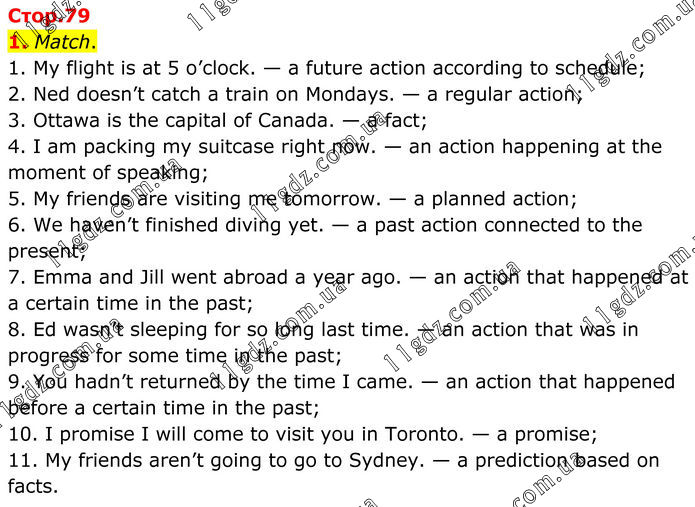 1. Match. 1. My flight is at 5 o’clock. — a future action according to schedule; 2. Ned doesn’t catch a train on Mondays. — a regular action; 3. Ottawa is the capital of Canada. — a fact; 4. I am packing my suitcase right now. — an action happening at the moment of speaking; 5. My friends are visiting me tomorrow. — a planned action; 6. We haven’t finished diving yet. — a past action connected to the present; 7. Emma and Jill went abroad a year ago. — an action that happened at a certain time in the past; 8. Ed wasn’t sleeping for so long last time. — an action that was in progress for some time in the past; 9. You hadn’t returned by the time I came. — an action that happened before a certain time in the past; 10. I promise I will come to visit you in Toronto. — a promise; 11. My friends aren’t going to go to Sydney. — a prediction based on facts.
