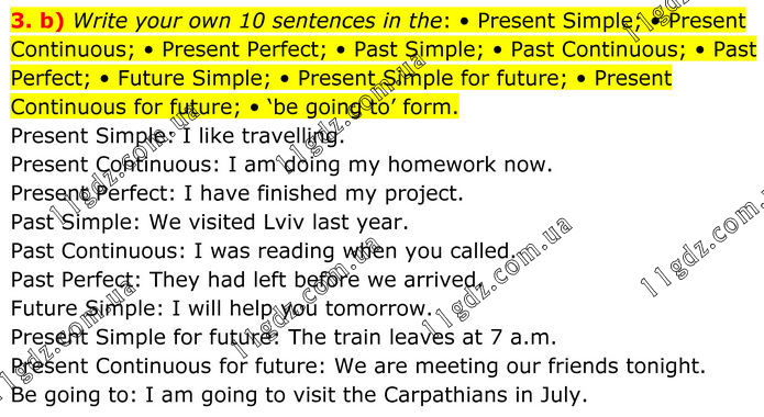 3. b) Write your own 10 sentences in the: • Present Simple; • Present Continuous; • Present Perfect; • Past Simple; • Past Continuous; • Past Perfect; • Future Simple; • Present Simple for future; • Present Continuous for future; • ‘be going to’ form. Present Simple: I like travelling. Present Continuous: I am doing my homework now. Present Perfect: I have finished my project. Past Simple: We visited Lviv last year. Past Continuous: I was reading when you called. Past Perfect: They had left before we arrived. Future Simple: I will help you tomorrow. Present Simple for future: The train leaves at 7 a.m. Present Continuous for future: We are meeting our friends tonight. Be going to: I am going to visit the Carpathians in July.