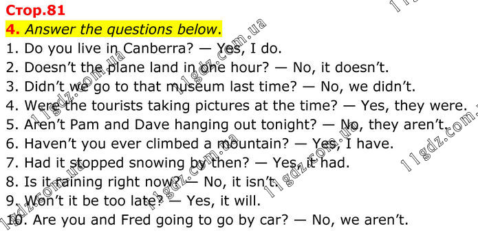 4. Answer the questions below. 1. Do you live in Canberra? — Yes, I do. 2. Doesn’t the plane land in one hour? — No, it doesn’t. 3. Didn’t we go to that museum last time? — No, we didn’t. 4. Were the tourists taking pictures at the time? — Yes, they were. 5. Aren’t Pam and Dave hanging out tonight? — No, they aren’t. 6. Haven’t you ever climbed a mountain? — Yes, I have. 7. Had it stopped snowing by then? — Yes, it had. 8. Is it raining right now? — No, it isn’t. 9. Won’t it be too late? — Yes, it will. 10. Are you and Fred going to go by car? — No, we aren’t.