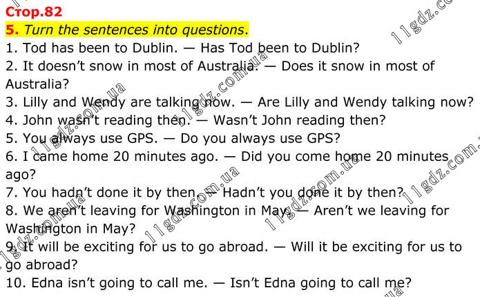 5. Turn the sentences into questions. 1. Tod has been to Dublin. — Has Tod been to Dublin? 2. It doesn’t snow in most of Australia. — Does it snow in most of Australia? 3. Lilly and Wendy are talking now. — Are Lilly and Wendy talking now? 4. John wasn’t reading then. — Wasn’t John reading then? 5. You always use GPS. — Do you always use GPS? 6. I came home 20 minutes ago. — Did you come home 20 minutes ago? 7. You hadn’t done it by then. — Hadn’t you done it by then? 8. We aren’t leaving for Washington in May. — Aren’t we leaving for Washington in May? 9. It will be exciting for us to go abroad. — Will it be exciting for us to go abroad? 10. Edna isn’t going to call me. — Isn’t Edna going to call me?