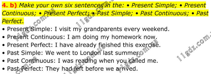 4. b) Make your own six sentences in the: • Present Simple; • Present Continuous; • Present Perfect; • Past Simple; • Past Continuous; • Past Perfect. • Present Simple: I visit my grandparents every weekend. • Present Continuous: I am doing my homework now. • Present Perfect: I have already finished this exercise. • Past Simple: We went to London last summer. • Past Continuous: I was reading when you called me. • Past Perfect: They had left before we arrived.