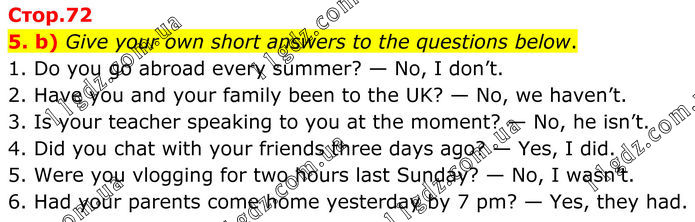 5. b) Give your own short answers to the questions below. 1. Do you go abroad every summer? — No, I don’t. 2. Have you and your family been to the UK? — No, we haven’t. 3. Is your teacher speaking to you at the moment? — No, he isn’t. 4. Did you chat with your friends three days ago? — Yes, I did. 5. Were you vlogging for two hours last Sunday? — No, I wasn’t. 6. Had your parents come home yesterday by 7 pm? — Yes, they had.