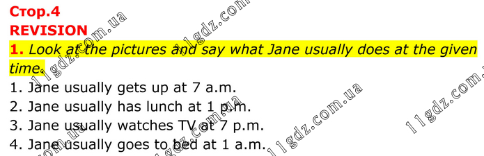 REVISION 1. Look at the pictures and say what Jane usually does at the given time. 1. Jane usually gets up at 7 a.m. 2. Jane usually has lunch at 1 p.m. 3. Jane usually watches TV at 7 p.m. 4. Jane usually goes to bed at 1 a.m.