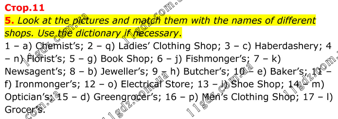 5. Look at the pictures and match them with the names of different shops. Use the dictionary if necessary. 1 – a) Chemist’s; 2 – q) Ladies’ Clothing Shop; 3 – c) Haberdashery; 4 – n) Florist’s; 5 – g) Book Shop; 6 – j) Fishmonger’s; 7 – k) Newsagent’s; 8 – b) Jeweller’s; 9 – h) Butcher’s; 10 – e) Baker’s; 11 – f) Ironmonger’s; 12 – o) Electrical Store; 13 – i) Shoe Shop; 14 – m) Optician’s; 15 – d) Greengrocer’s; 16 – p) Men’s Clothing Shop; 17 – l) Grocer’s.