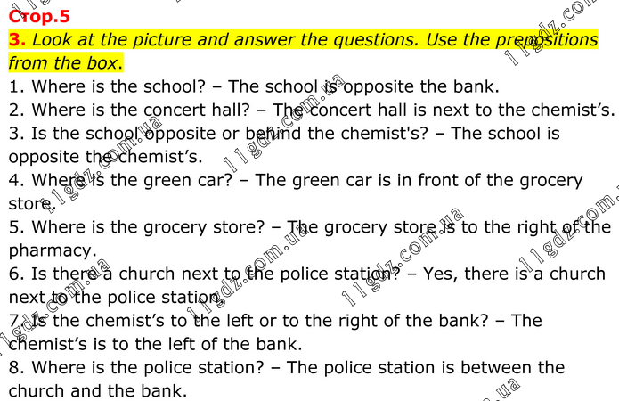 3. Look at the picture and answer the questions. Use the prepositions from the box. 1. Where is the school? – The school is opposite the bank. 2. Where is the concert hall? – The concert hall is next to the chemist’s. 3. Is the school opposite or behind the chemist's? – The school is opposite the chemist’s. 4. Where is the green car? – The green car is in front of the grocery store. 5. Where is the grocery store? – The grocery store is to the right of the pharmacy. 6. Is there a church next to the police station? – Yes, there is a church next to the police station. 7. Is the chemist’s to the left or to the right of the bank? – The chemist’s is to the left of the bank. 8. Where is the police station? – The police station is between the church and the bank.